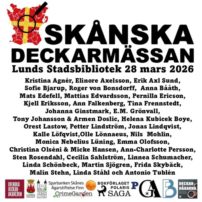 Årets skånska deckarevent hålls för fjärde gången på Lunds Stadsbibliotek den 28 mars kl. 11-15! Träffa 35 skånska deckarförfattare; lyssna på spännande scensamtal; mingla i mässområdet; delta i den skånska deckartipspromenaden och vinn fina priser; se Svenska Deckarakademins deckaromslagsutställning och träffa andra deckarläsare. Huvudarrangörer och moderatorer Kerstin Bergman och Gunilla Wedding.